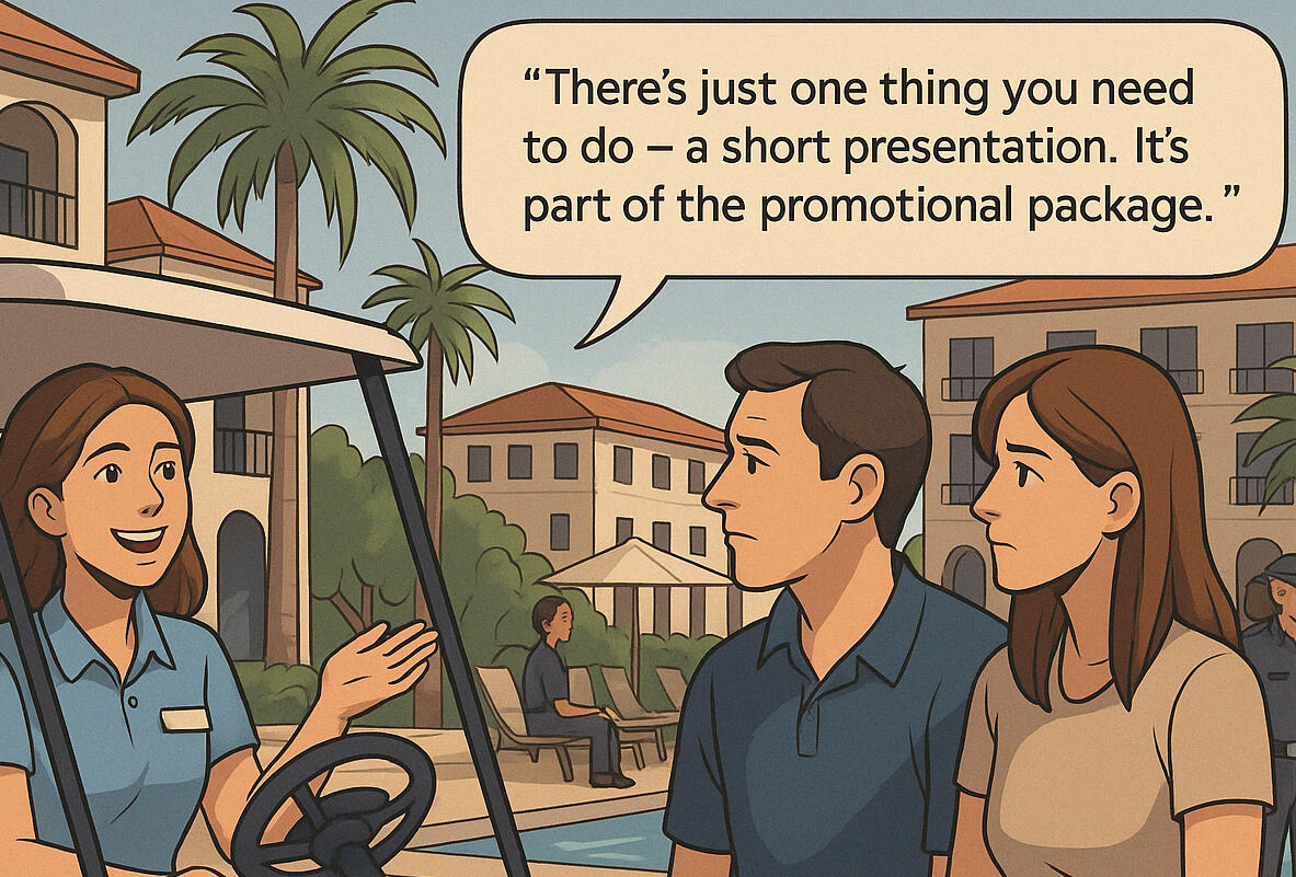 “There’s just one thing you need to do — a short presentation. It’s part of the promotional package.”We knew about it. That was part of the deal — $199 for 3 nights, in exchange for sitting through a 1–2 hour talk.We didn’t think much of it.So we said, “Okay. No problem.”
